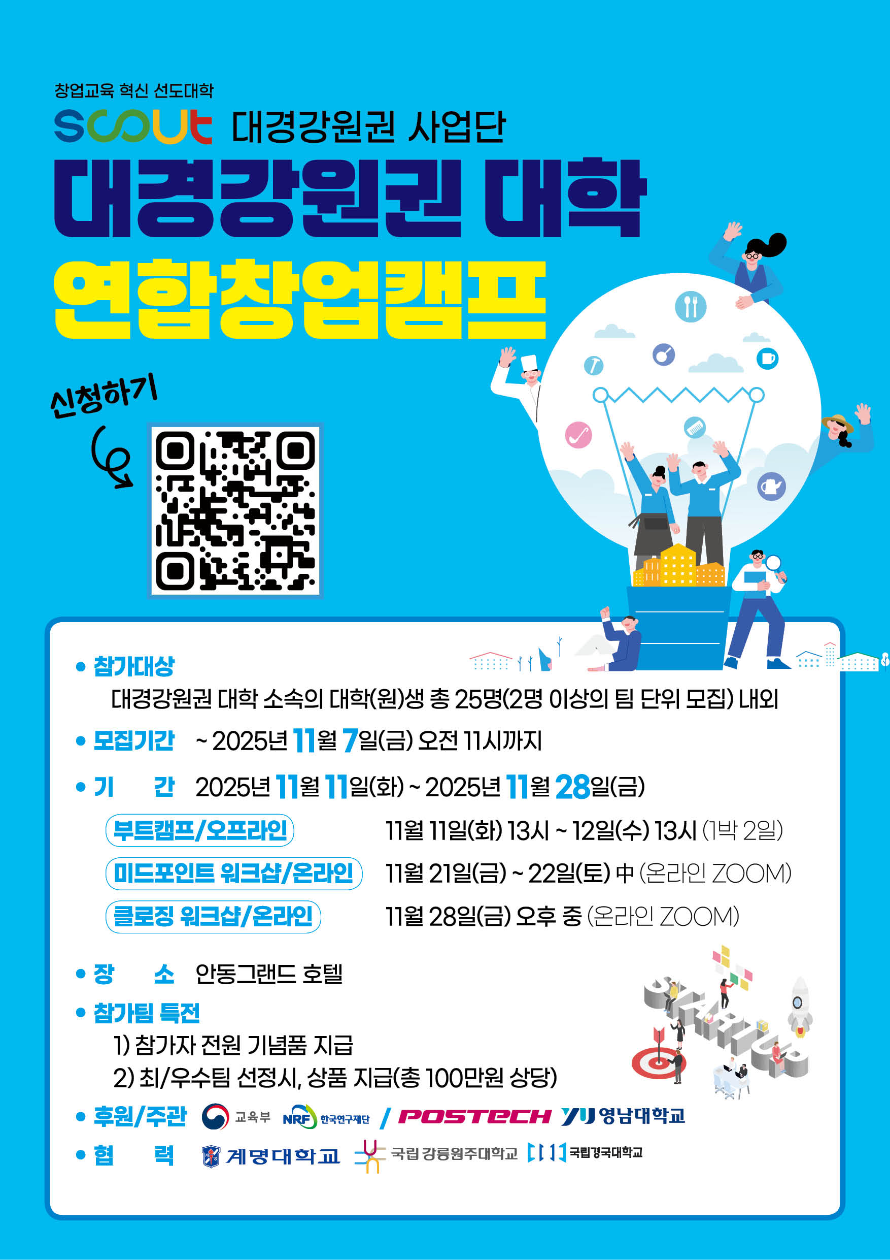 산학협력단 창업지원본부에서 대경강원권 대학 연합창업캠프 참가자를 모집합니다.